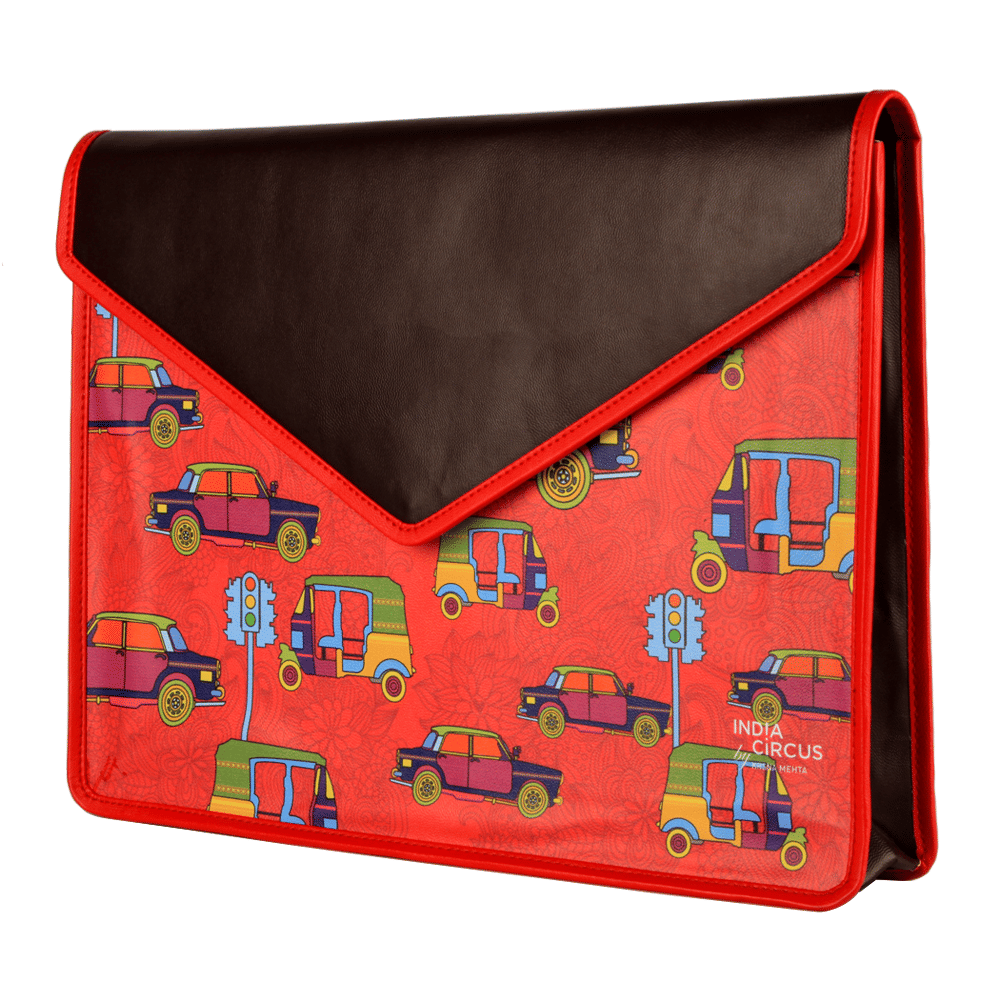 This colourful document holder celebrates the vibrancy and fun of the Indian transport system.