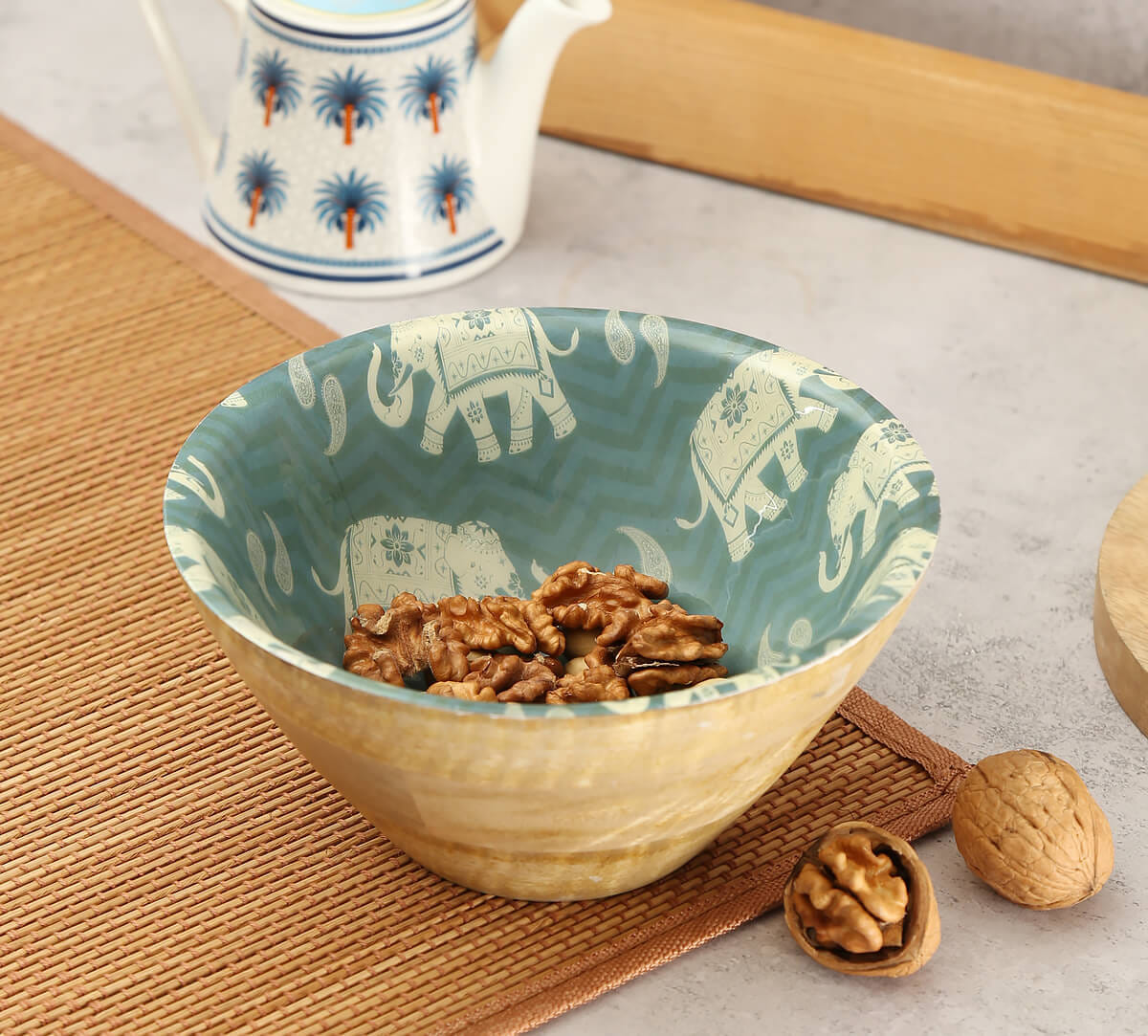 The artwork on the elephants against the sombre chevron cyan background in this beautiful Parading Tuskers Wooden Bowl steals our attention. It's difficult to miss the intricate details on this piece from the house of India Circus. Whenever you serve snacks or fruits or bread basket, the tuskers will definitely catch your guests by surprise with their designs. This is a good enough reason for you to pick up this colourful bowl of mango wood online today.