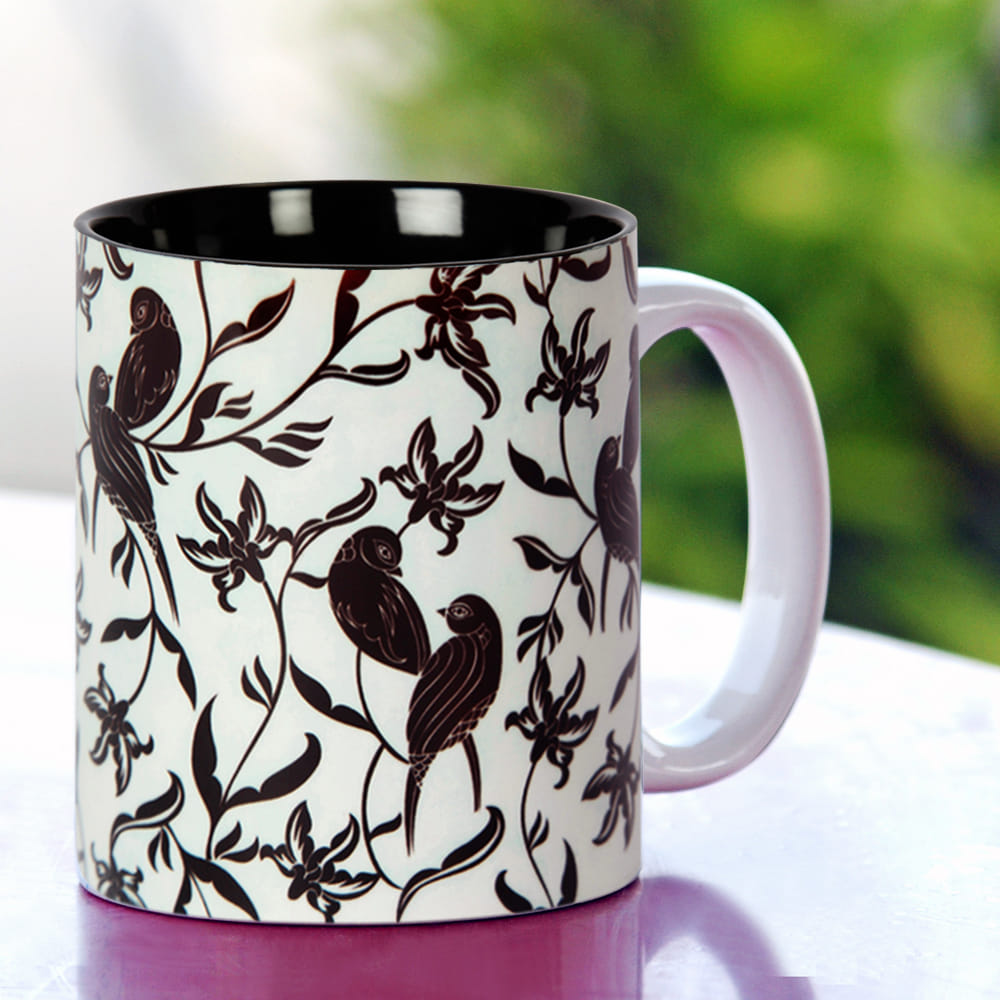This Mug sees a flock of beautiful black birds enjoying themselves on twigs and branches, and a pretty little pink bird brings in a respite of colour.
