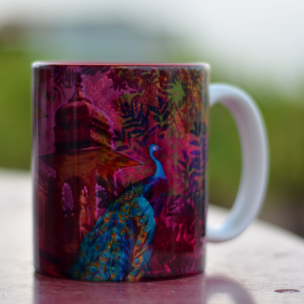 This Mug features a Royal peacock who seeks a moment of solitude in the palace gardens.